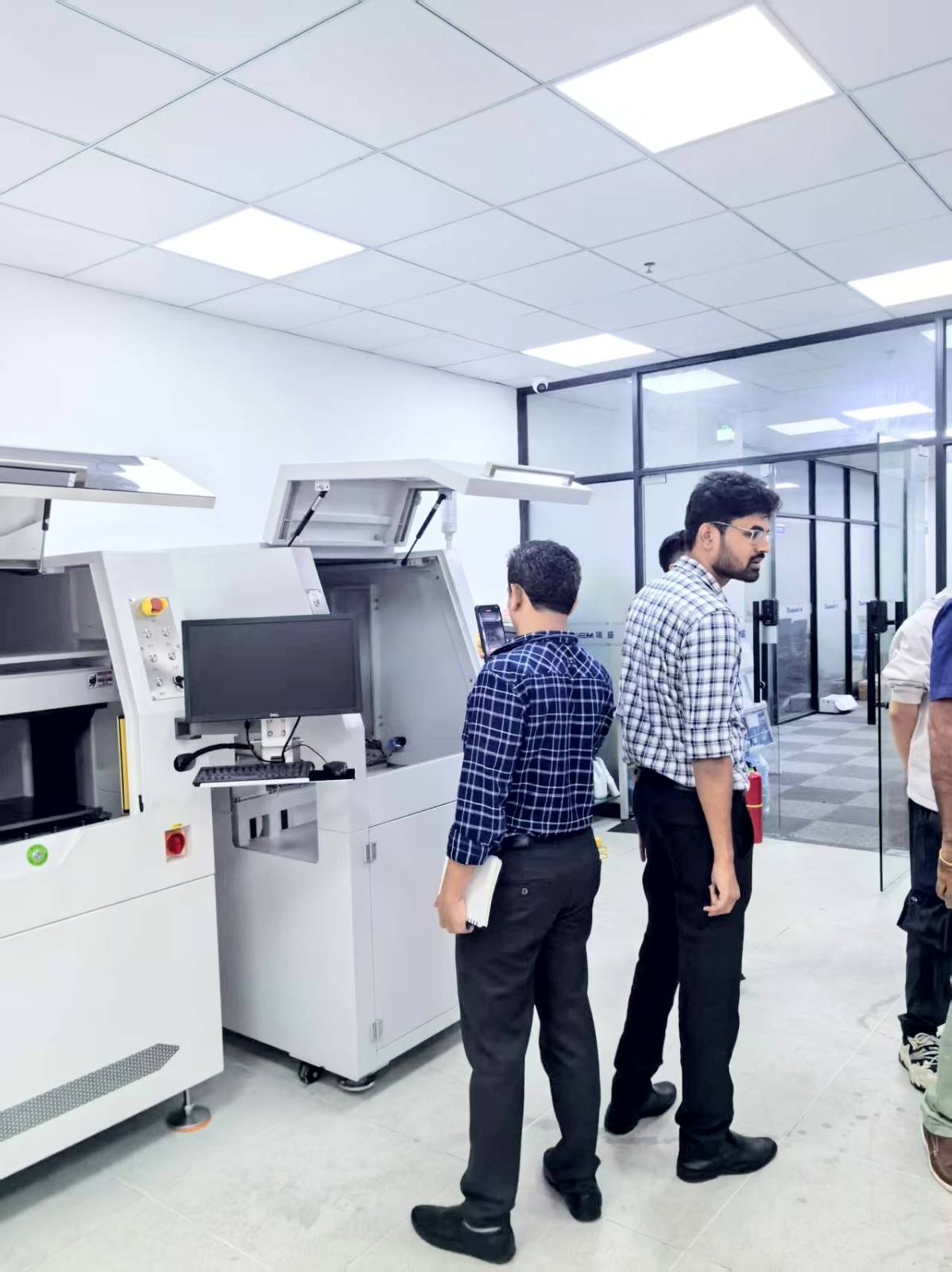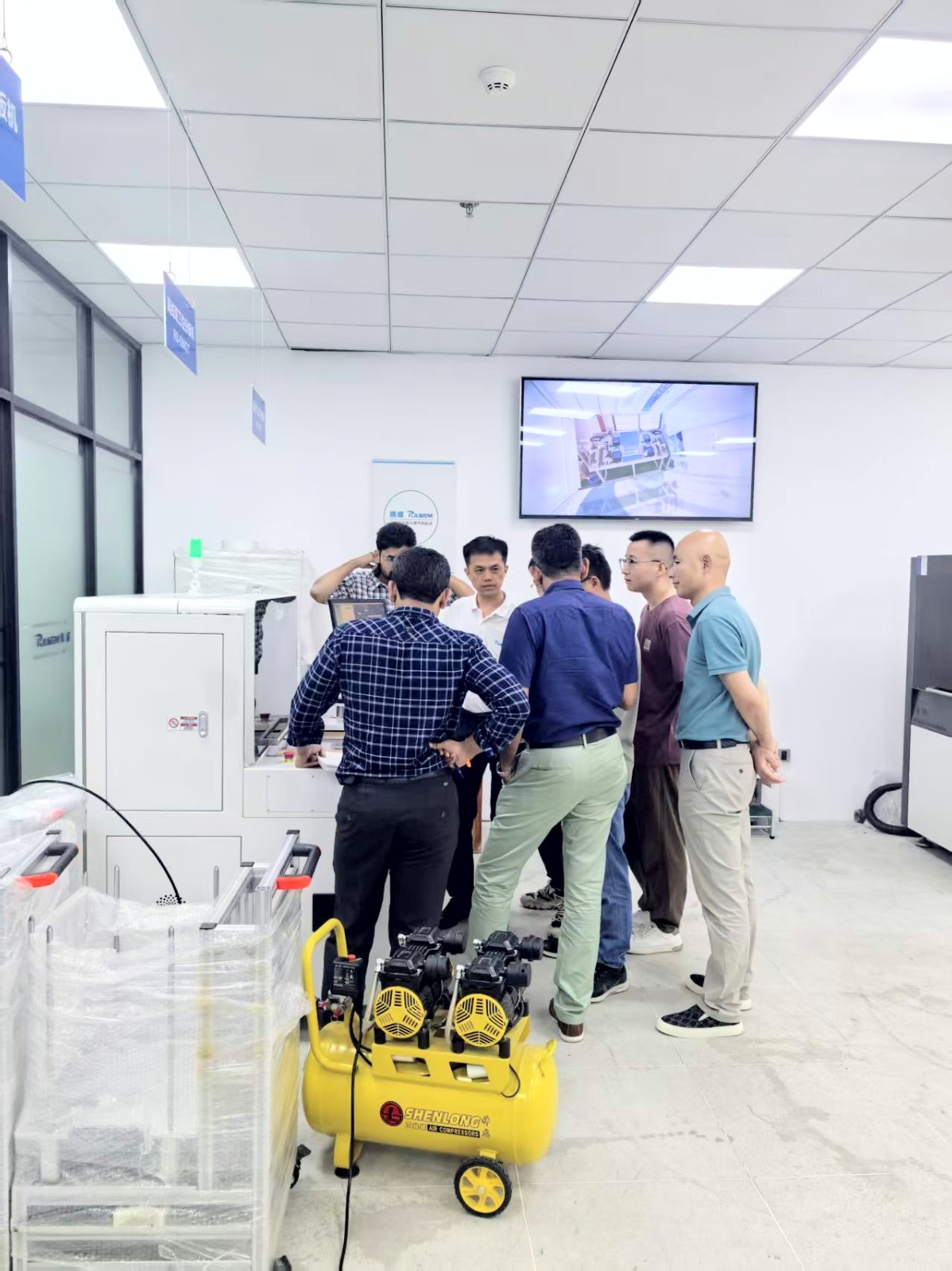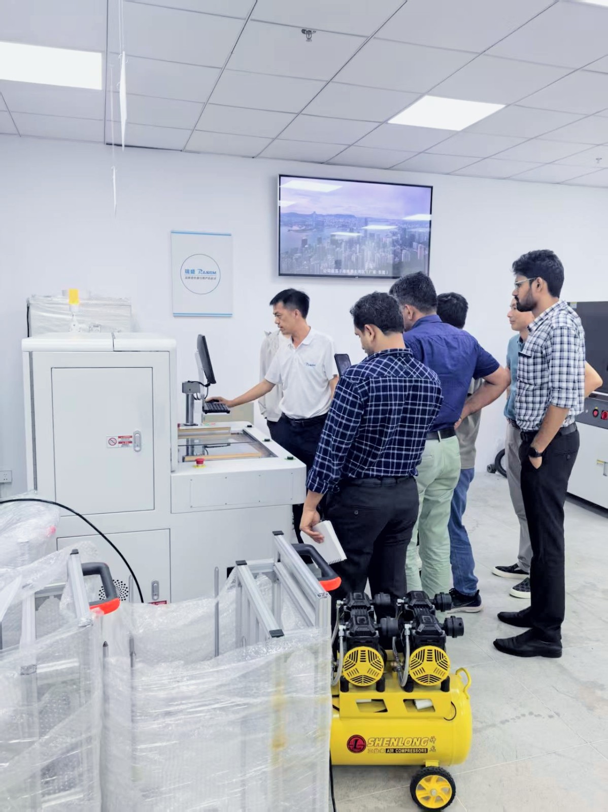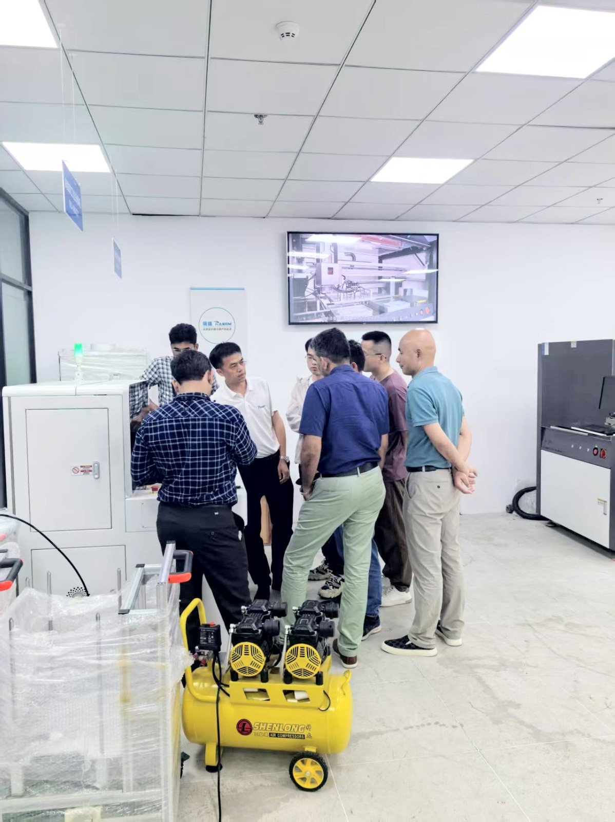 在瑞盛展厅内,印度客户全面了解了瑞盛分板机设备产品。代表团仔细观摩了代表行业先进水平的全自动分板解决方案,并对瑞盛在精密机械设计、智能控制系统等维度的持续探索表示高度认同。